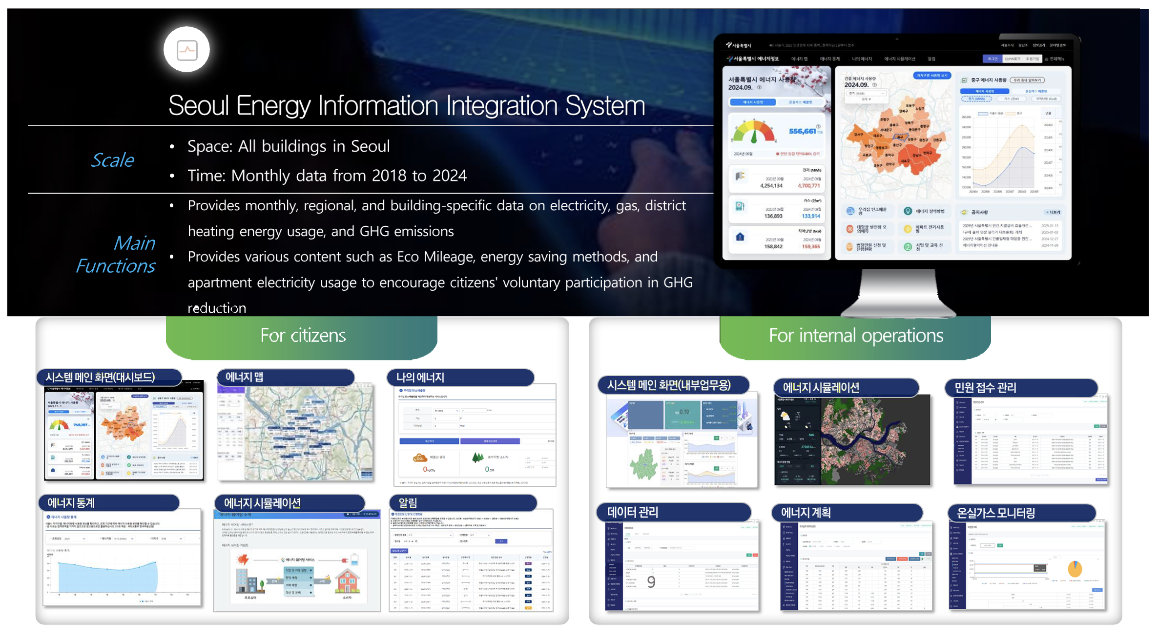 The Seoul Energy Integration System consolidates real-time data from diverse energy sources into a single platform. This enables better planning, smarter investment, efficient operation of renewables, and greater transparency for citizens.