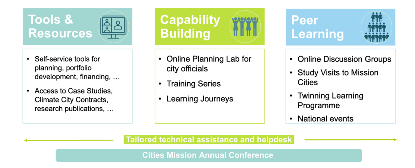 Mission-minded cities, referring to cities with ambitious climate action, are eligible to benefit from the Mission’s support. The Cities Mission Platform provides an inclusive offer which is structured around three main components: tools and resources, capability building and peer learning.