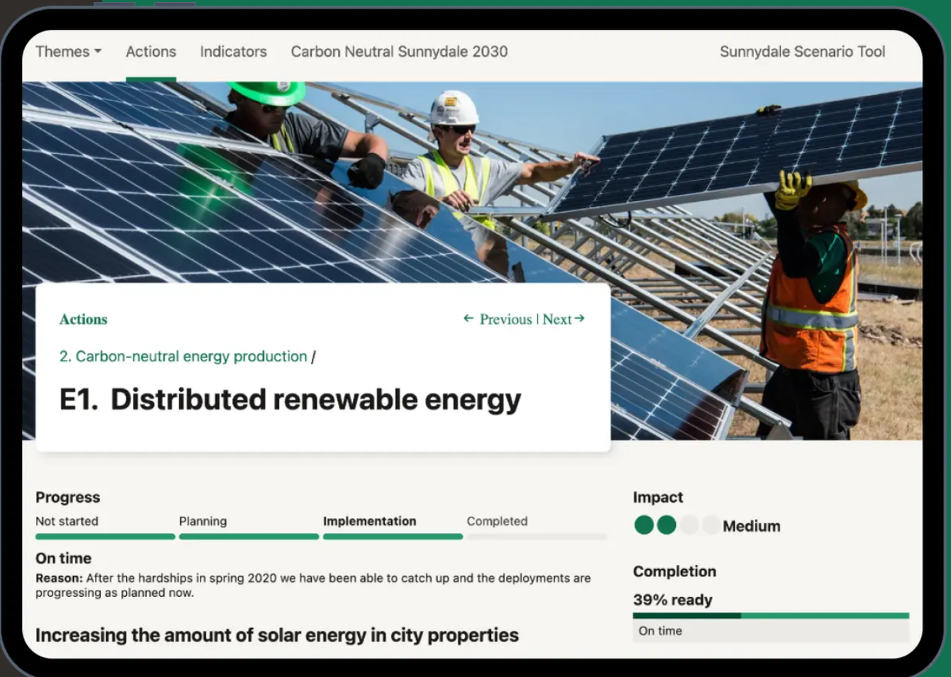 The platform enables administrators to assign responsibility for actions, track progress through dashboards, link those actions to measurable indicators, integrate data from various sources, and publish results for transparency. It is built on an open-source model (AGPLv3) and runs on carbon-neutral servers, and supports integration with sign-in systems and organisational structures.